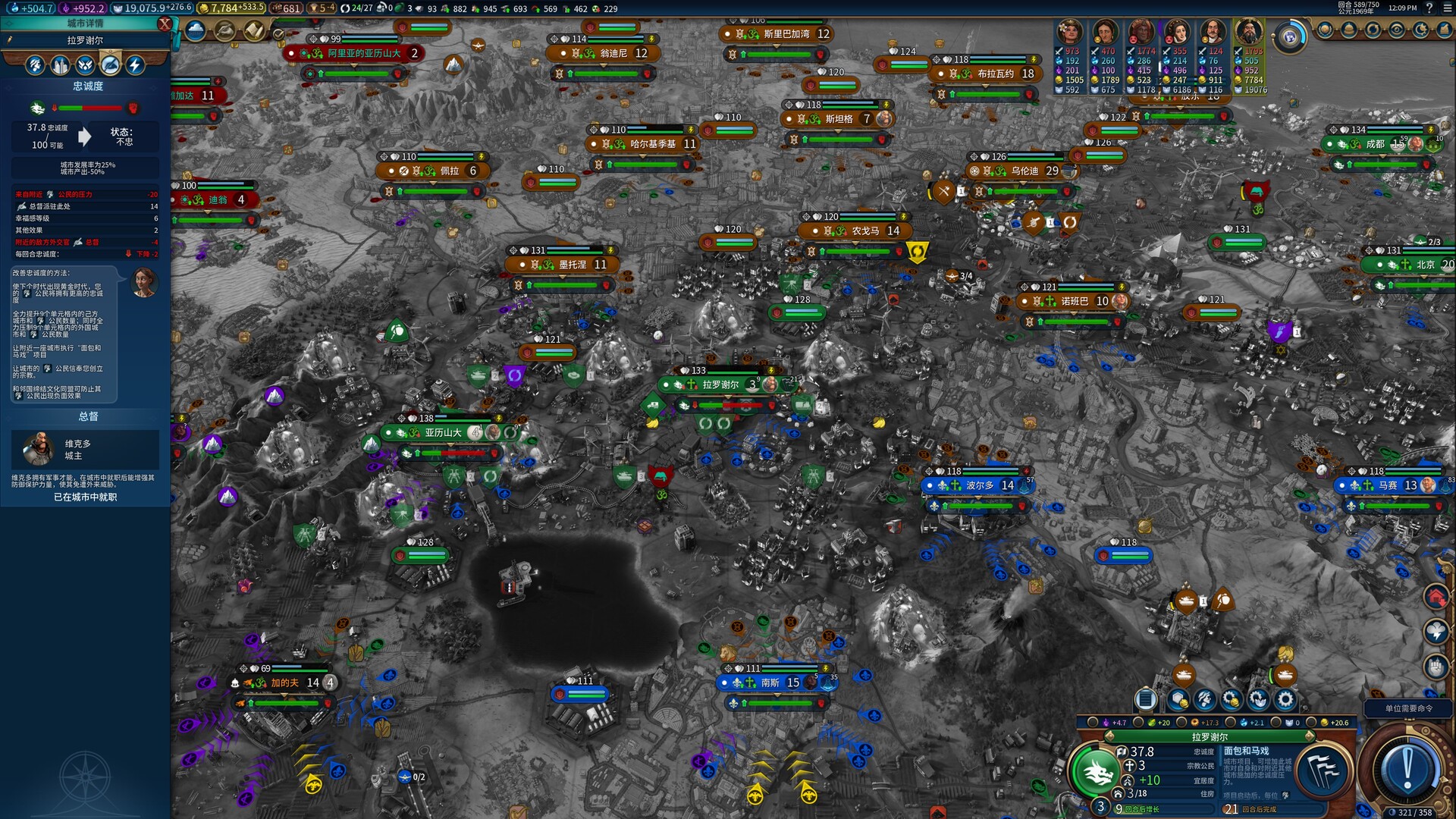 因此,如果理想情况下,两个城市都有娱乐中心,都能执行 面包和马戏 项目,说不定就能维持忠诚度。然后通过大量商人贸易来获取食物,增加人口,最终稳定住忠诚度,飞地就可以维持。