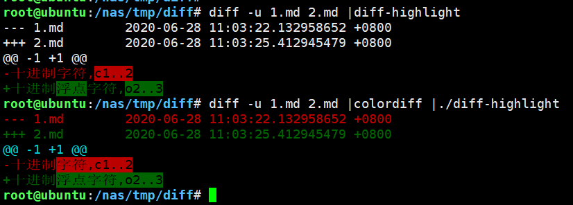 colordiff 只能高亮显示行级别的不同,如果需要高亮被修改的字符,需要使用其他工具,比如 diff-highlight ,有不同语言的版本,Python 版使用 pip3 install diff-highlight 来安装。此功能的效果就类似 Github,如图: