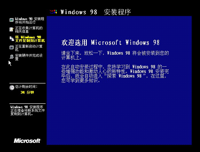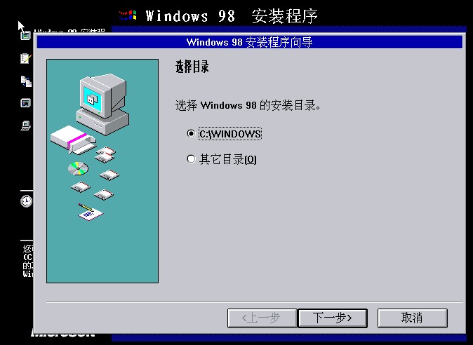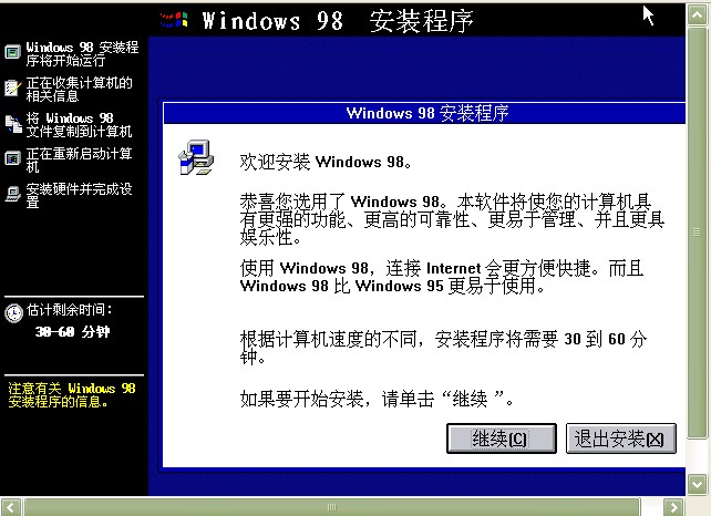 用了新下载的iso镜像,很顺利的进入了图形安装界面,看来是安装包的问题。(附下载地址:ftp://www.sooweb.net/Share/system/win98/win98.iso)
