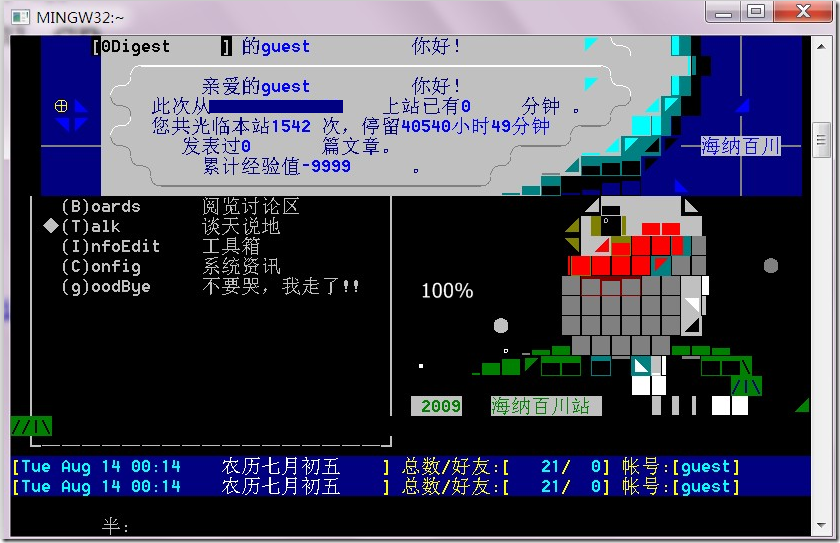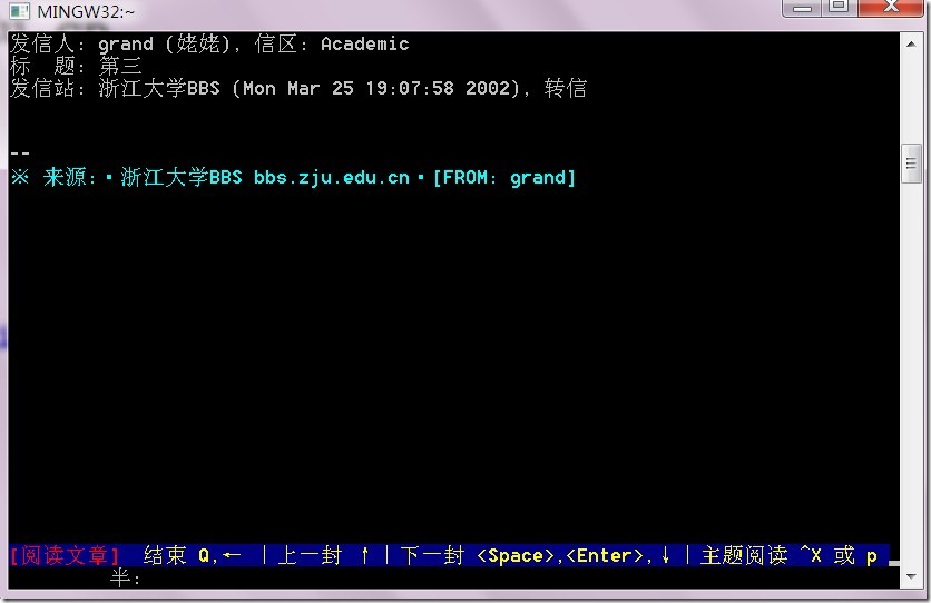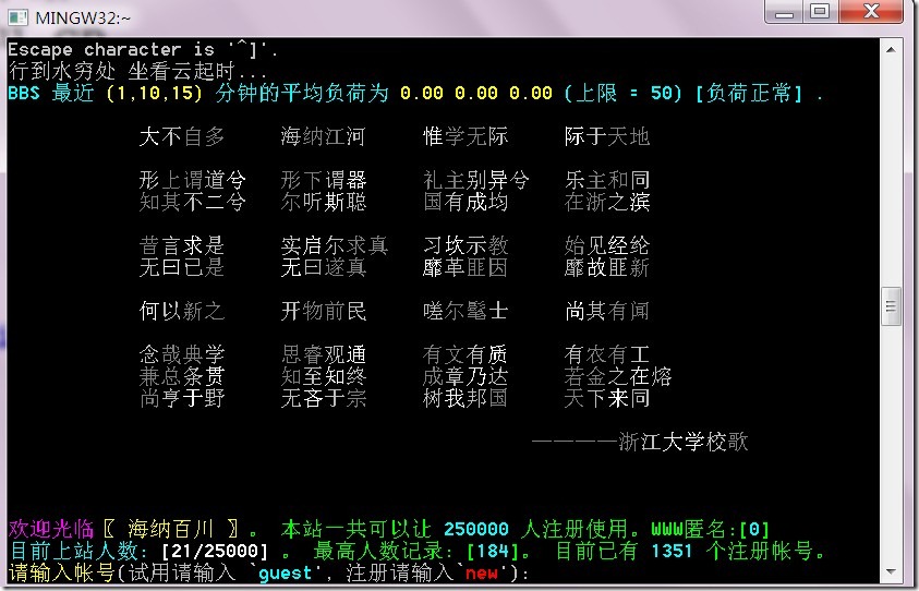 今天偶然看到浙江大学的官方论坛,居然还是telnet方式登录,在MinGW里面试了下,连接成功: