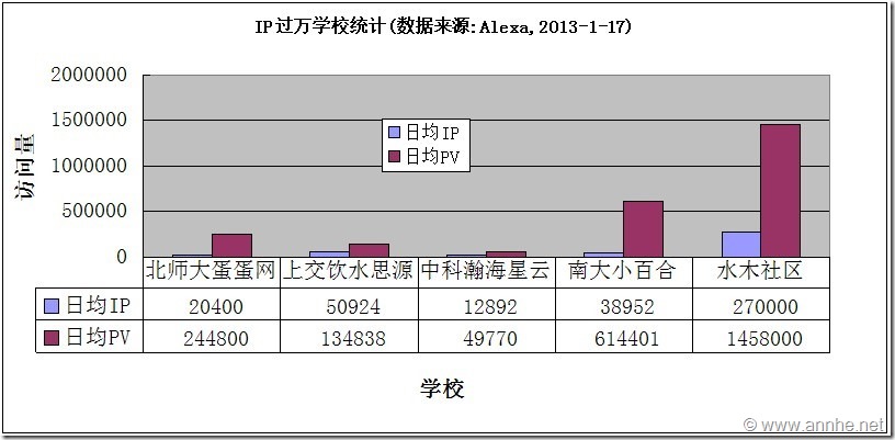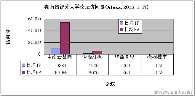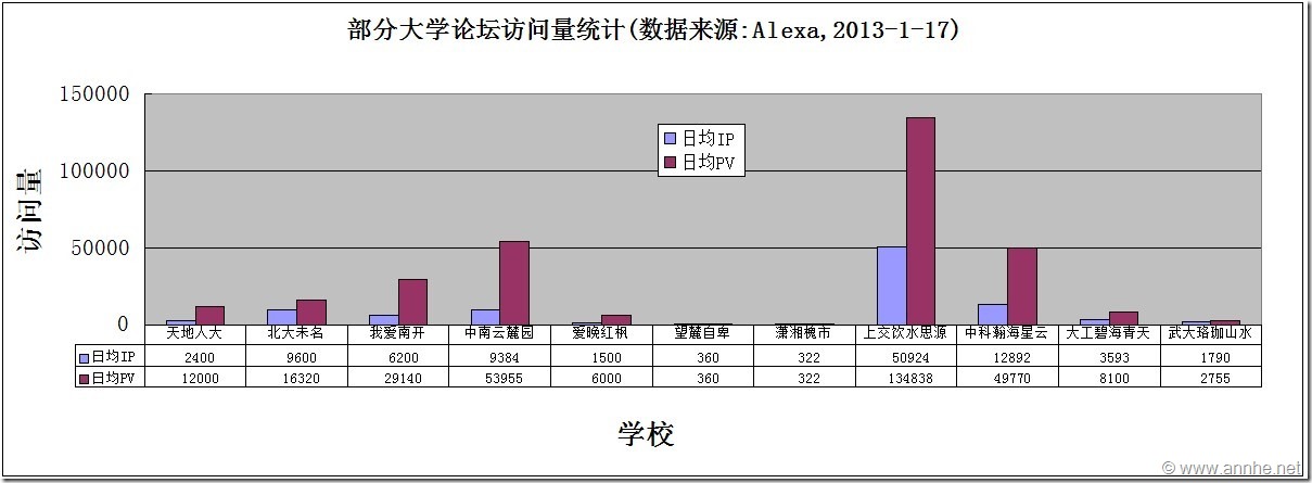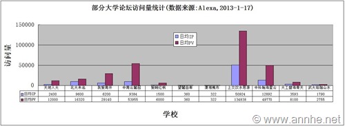首先是部分高校论坛的访问量,数据来源是Alexa,2013年1月17日。
