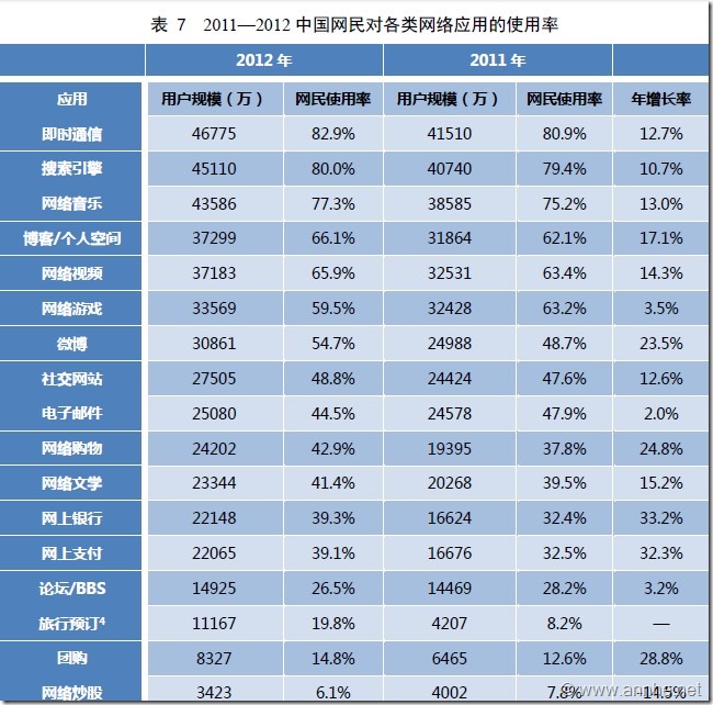 2012年中国互联网普及率为42.1%,较2011年底提升3.8个百分点,普及率的增长幅度相比上年继续缩小。手机网民4.2亿,年增长率为18.1%,网民中使用手机的比例继续提升,第一大上网终端的地位更加稳固,但是手机网民规模与整体PC网民(包括台式电脑和笔记本电脑)相比还有一定差距。