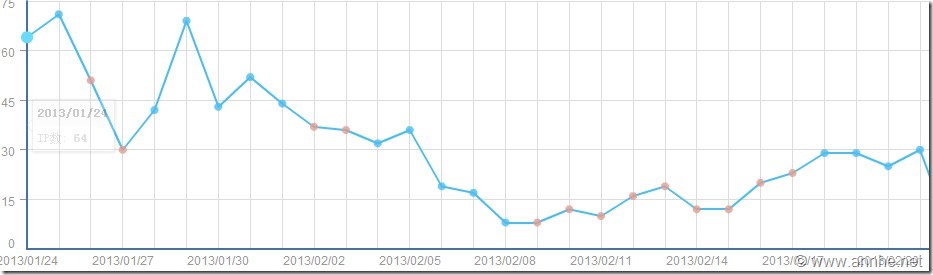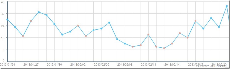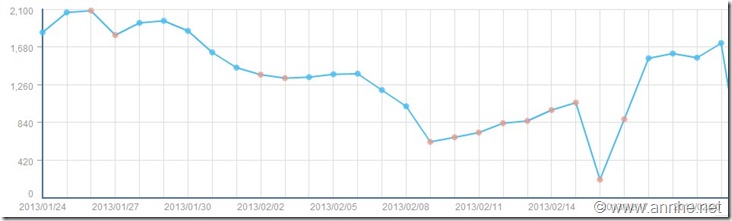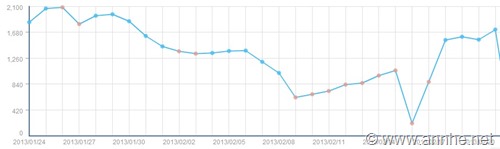 Post navigation ← Previous Next → 春节曲线图 Posted on 2013 年 2 月 21 日 by annhe 3.4K Views 过年了,大家上网是不是少了呢?从下面几张图或许可以看出来. 图一,本博客,一直表现不佳,春节期间更是惨不忍睹: 图二,我的论坛,节前节后一样凄惨,不过还是可以看到一个模糊的小低谷: 图三,某网站,最低那次是个意外,此图可以较好的反应春节期间大家上网少了: 相关文章: 扫描版PDF转文字