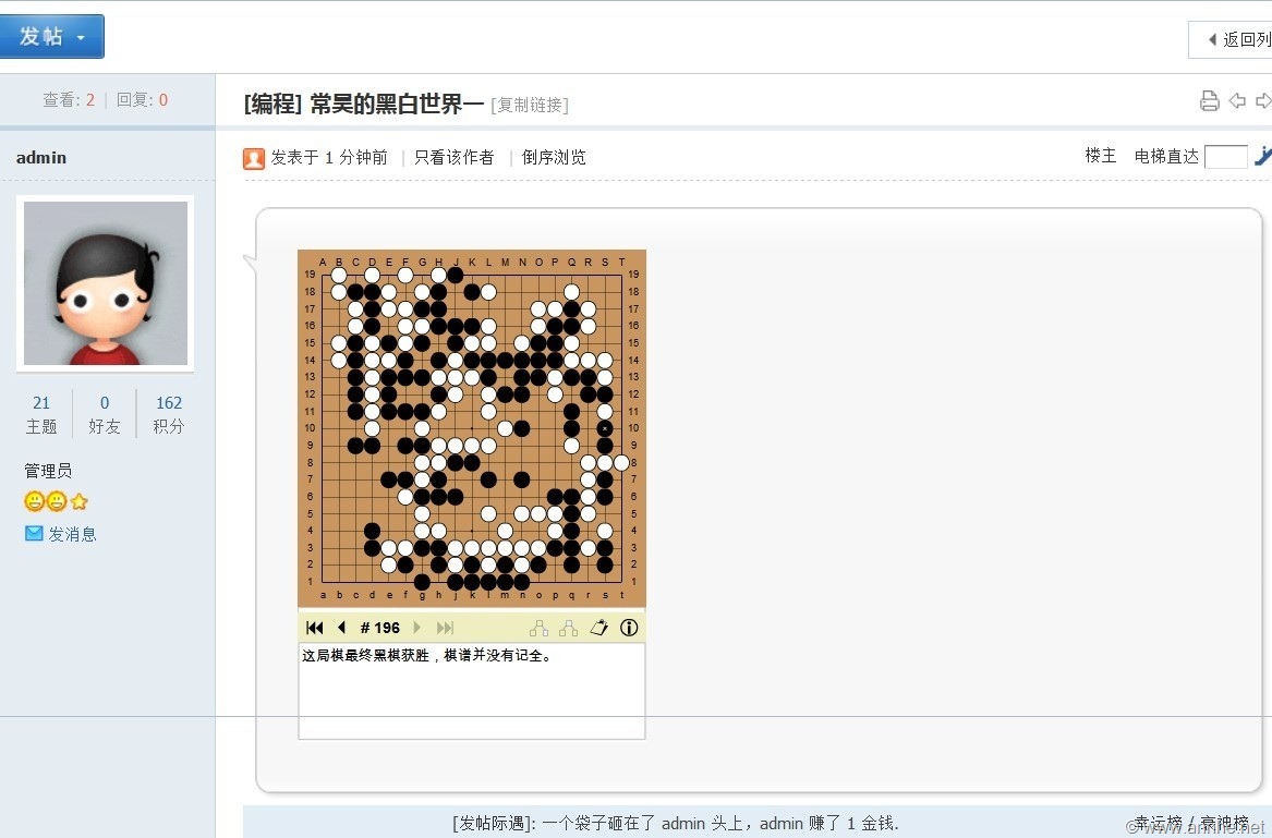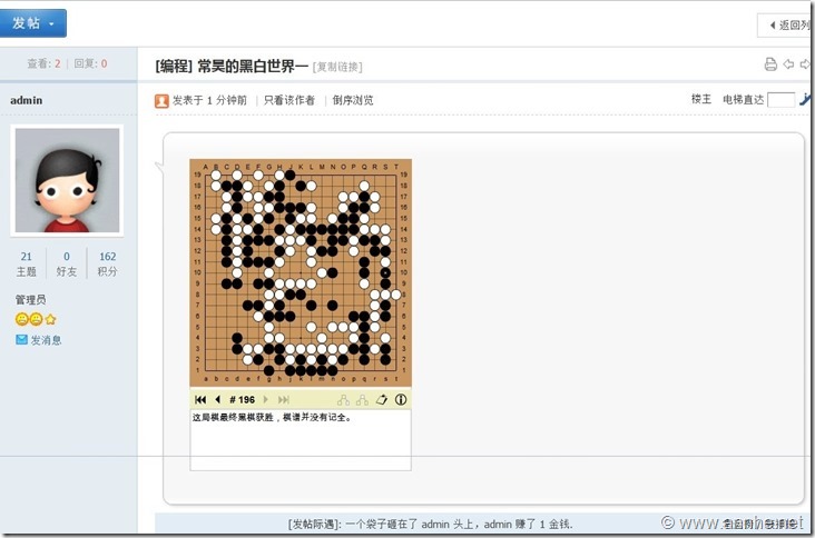 围棋在线打谱,用现成的flash打谱程序,只需要嵌入discuz即可,非常简单的一件事。可是我PHP刚入门,javascript基本没学,参考类似的插件也用了近一天才出成品,修改bug又差不多用了一下午。 /lh/