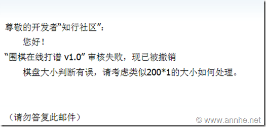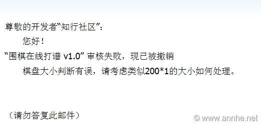 关于棋盘大小,还有一段波折,一开始没有缓存插件变量值就直接读取了插件变量,结果都是空值,不管怎么设置棋盘大小都是一样的,提交审核后才发现,于是连夜修改。最终通过定义私有成员解决了问题,第二天,应用中心发来审核失败的邮件: