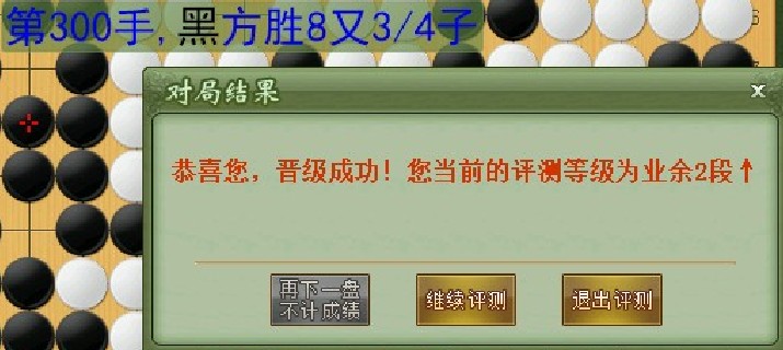 最终胜了8.75子。于是,就这么刷到2段去了。 /ku/ 虽然自己很清楚,在2段基本呆不住的。基于此,我决定,未来几天不下评测了,我要在2段位置多呆几天~哈哈~。