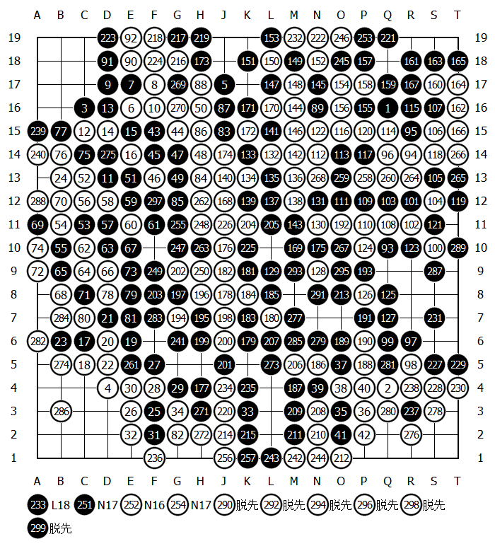 第二个对手,1段,胜率50%比我高一些。我执黑,有些急躁,开局就送对方征一子棋筋。还好后来引征成功,顺势断掉白棋,杀心已起,可惜功力不够,没杀到,还搭进去几颗黑子。不过,白棋也被封在左边了,还算是得利。随后,白100手的急躁让黑棋抓住机会,白棋上下两队均受攻击。最终,白棋虽然活了上边一队,却也没多少实地。下边一队白棋也葬送了。现在,黑棋只要在中腹多围些空就可以胜了。