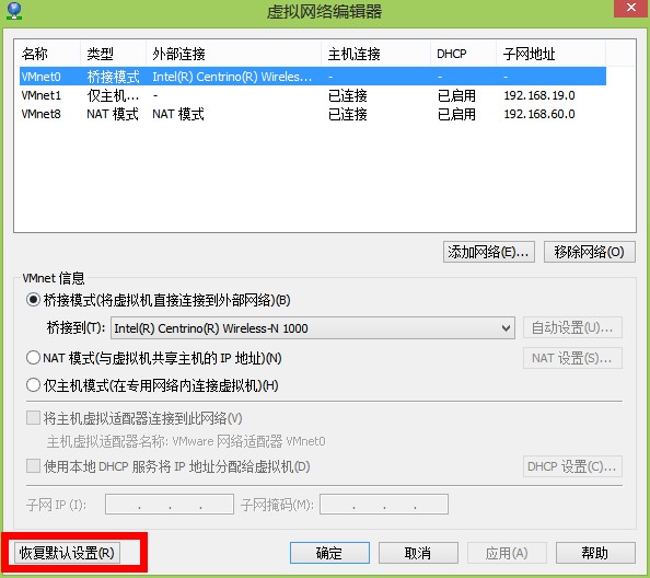 解决:虚拟网络编辑器中恢复默认设置