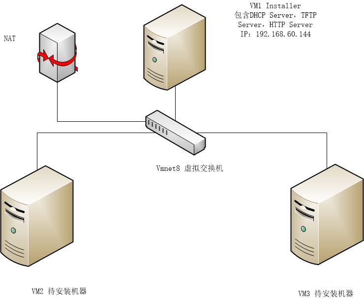 限于条件,本文安装服务器和待安装机器均使用VMware虚拟机。拓扑结构如下图所示