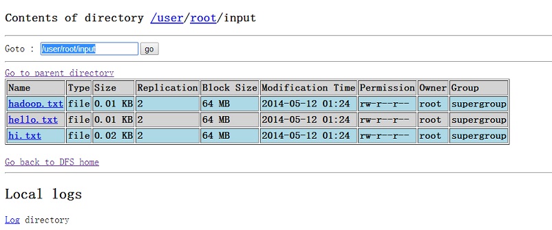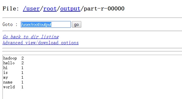 [root@Master hadoop]# hadoop fs -cat output/* hadoop 2 hello 2 hi 1 is 1 my 1 name 1 world 1 cat: File does not exist: /user/root/output/_logs