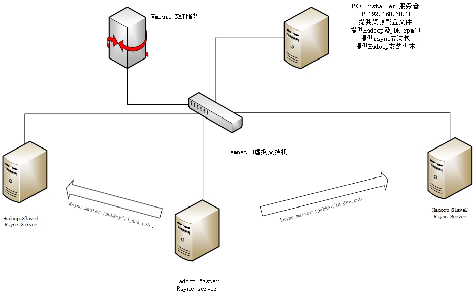 首先需要搭建能够进行Hadoop集群安装配置的PXE Installer服务器。该服务器提供Hadoop所需软件包、资源配置文件及Hadoop安装脚本[4]。本次实验集群中的每台机器都被配置为rsync服务器,以便同步Master的公钥文件。