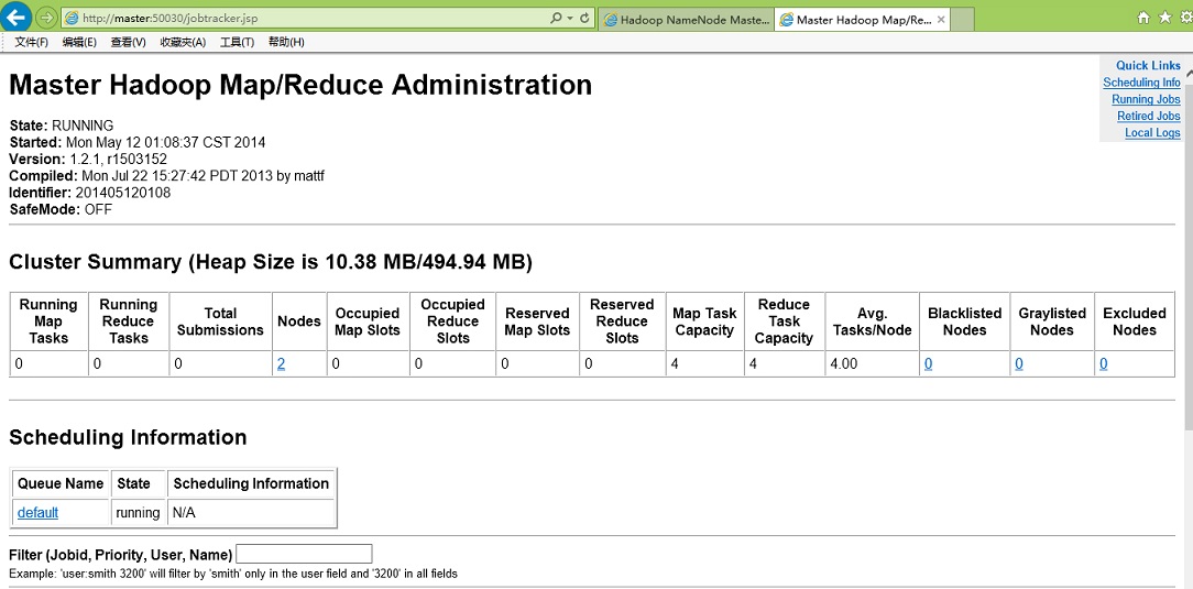 涉及到core-site.xml,hdfs-site.xml,mapred-site.xml几个文件的配置,及masters,slaves的配置[6]。这里需要注意,像集群新加slave时,请直接在资源分配文件末尾添加。新加集群存在masters,slaves及hosts文件不同步的问题,可以考虑用cfengine或者puppet,待后续解决。