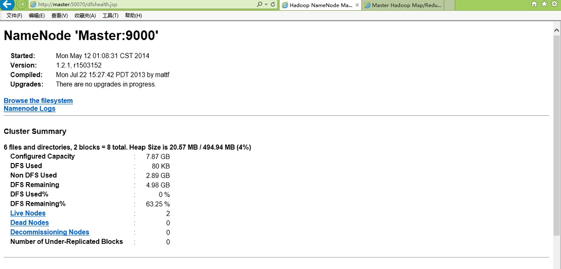 [root@Master ~]# hadoop namenode -format 14/05/12 01:07:43 INFO namenode.NameNode: STARTUP_MSG: /************************************************************ STARTUP_MSG: Starting NameNode STARTUP_MSG: host = Master/192.168.60.20 STARTUP_MSG: args = [-format] STARTUP_MSG: version = 1.2.1 STARTUP_MSG: build = https://svn.apache.org/repos/asf/hadoop/common/branches/branch-1.2 -r 1503152; compiled by 'mattf' on Mon Jul 22 15:27:42 PDT 2013 STARTUP_MSG: java = 1.7.0_51 ************************************************************/ Re-format filesystem in /tmp/hadoop-root/dfs/name ? (Y or N) y Format aborted in /tmp/hadoop-root/dfs/name 14/05/12 01:07:59 INFO namenode.NameNode: SHUTDOWN_MSG: /************************************************************ SHUTDOWN_MSG: Shutting down NameNode at Master/192.168.60.20 ************************************************************/
