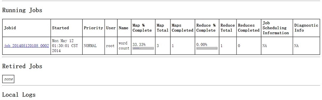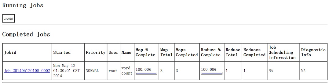 [root@Master hadoop]# hadoop jar /usr/share/hadoop/hadoop-examples-1.2.1.jar wordcount input/ output 14/05/12 01:30:00 INFO input.FileInputFormat: Total input paths to process : 3 14/05/12 01:30:00 INFO util.NativeCodeLoader: Loaded the native-hadoop library 14/05/12 01:30:00 WARN snappy.LoadSnappy: Snappy native library not loaded 14/05/12 01:30:01 INFO mapred.JobClient: Running job: job_201405120108_0002 14/05/12 01:30:02 INFO mapred.JobClient: map 0% reduce 0% 14/05/12 01:30:20 INFO mapred.JobClient: map 33% reduce 0% 14/05/12 01:30:28 INFO mapred.JobClient: map 100% reduce 0% 14/05/12 01:30:35 INFO mapred.JobClient: map 100% reduce 100% 14/05/12 01:30:37 INFO mapred.JobClient: Job complete: job_201405120108_0002 14/05/12 01:30:37 INFO mapred.JobClient: Counters: 29 14/05/12 01:30:37 INFO mapred.JobClient: Job Counters 14/05/12 01:30:37 INFO mapred.JobClient: Launched reduce tasks=1 14/05/12 01:30:37 INFO mapred.JobClient: SLOTS_MILLIS_MAPS=49355 14/05/12 01:30:37 INFO mapred.JobClient: Total time spent by all reduces waiting after reserving slots (ms)=0 14/05/12 01:30:37 INFO mapred.JobClient: Total time spent by all maps waiting after reserving slots (ms)=0 14/05/12 01:30:37 INFO mapred.JobClient: Launched map tasks=3 14/05/12 01:30:37 INFO mapred.JobClient: Data-local map tasks=3 14/05/12 01:30:37 INFO mapred.JobClient: SLOTS_MILLIS_REDUCES=14236 14/05/12 01:30:37 INFO mapred.JobClient: File Output Format Counters 14/05/12 01:30:37 INFO mapred.JobClient: Bytes Written=47 14/05/12 01:30:37 INFO mapred.JobClient: FileSystemCounters 14/05/12 01:30:37 INFO mapred.JobClient: FILE_BYTES_READ=106 14/05/12 01:30:37 INFO mapred.JobClient: HDFS_BYTES_READ=371 14/05/12 01:30:37 INFO mapred.JobClient: FILE_BYTES_WRITTEN=218711 14/05/12 01:30:37 INFO mapred.JobClient: HDFS_BYTES_WRITTEN=47 14/05/12 01:30:37 INFO mapred.JobClient: File Input Format Counters 14/05/12 01:30:37 INFO mapred.JobClient: Bytes Read=46 14/05/12 01:30:37 INFO mapred.JobClient: Map-Reduce Framework 14/05/12 01:30:37 INFO mapred.JobClient: Map output materialized bytes=118 14/05/12 01:30:37 INFO mapred.JobClient: Map input records=3 14/05/12 01:30:37 INFO mapred.JobClient: Reduce shuffle bytes=118 14/05/12 01:30:37 INFO mapred.JobClient: Spilled Records=18 14/05/12 01:30:37 INFO mapred.JobClient: Map output bytes=82 14/05/12 01:30:37 INFO mapred.JobClient: Total committed heap usage (bytes)=617562112 14/05/12 01:30:37 INFO mapred.JobClient: CPU time spent (ms)=6190 14/05/12 01:30:37 INFO mapred.JobClient: Combine input records=9 14/05/12 01:30:37 INFO mapred.JobClient: SPLIT_RAW_BYTES=325 14/05/12 01:30:37 INFO mapred.JobClient: Reduce input records=9 14/05/12 01:30:37 INFO mapred.JobClient: Reduce input groups=7 14/05/12 01:30:37 INFO mapred.JobClient: Combine output records=9 14/05/12 01:30:37 INFO mapred.JobClient: Physical memory (bytes) snapshot=553525248 14/05/12 01:30:37 INFO mapred.JobClient: Reduce output records=7 14/05/12 01:30:37 INFO mapred.JobClient: Virtual memory (bytes) snapshot=2894249984 14/05/12 01:30:37 INFO mapred.JobClient: Map output records=9