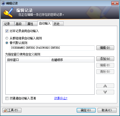 之后修改自动输入的规则,默认规则是 {USERNAME}{TAB}{PASSWORD}{ENTER},不能正确登录服务器,编辑密码,在自动输入选项卡下,勾选替代默认规则,改为:{USERNAME}{ENTER}{PASSWORD}{ENTER},即输入用户名,回车,输入密码,回车。