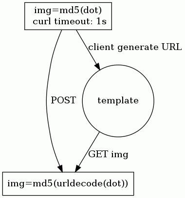 其实一开始设计GraphViz API返回的是图片URL,于是Discuz调用的时候要等待页面所有的dot源码都获得相应图片URL后才加载页面,慢的无法忍受,后来改成在模板里直接进行API调用,即img src为API链接加GET参数方式(类似Google Charts API),速度明显提升。但是现在大型源码必须用POST方式了,模板里img src不好写了,需要设计一种客户端不等待服务端图片生成完成就开始加载页面的方式,img src只能有客户端来生成了,这样就要求服务器端也有相同的图片文件生成方式以便调用: