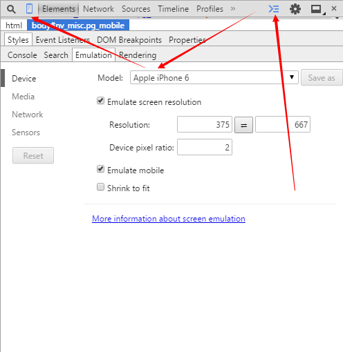 F12审查元素,点击show drawer,点击Emulation,点击Toggle device mode