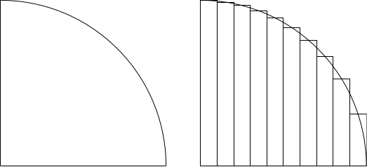 这些长方形的面积之和近似等于四分之一圆的面积。分的长方形越多,近似值与 π 越逼近。对于每个长方形来说,宽度 w 等于半径除以长方形的个数,高度 h 与长方形的位置有关。假设某个长方形在水平方向上的中点为 x,那么它的高度 h 可以通过下面的距离公式得到: