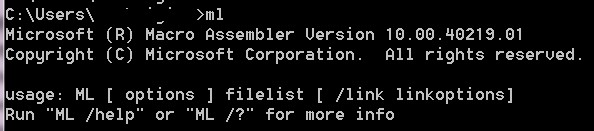 要搭建汇编开发环境,在微软官网看到,装了masm 8.0之后,会将ml.exe(汇编器)安装在/vc/bin/目录,我去自己的VS2010中的vc目录下看到已经有ml.exe了,而且是10.0版的。于是就在cmd中试了一下,提示找不到命令,又试了一下cl和link命令,结果都一样,才想起没有设置环境变量,将 /Microsoft Visual Studio 10.0\VC\bin加入环境变量之后,ml命令生效: