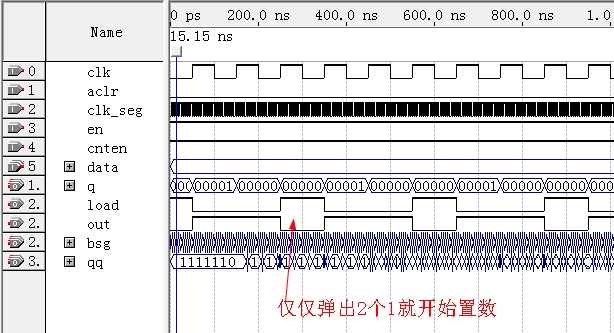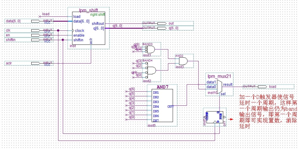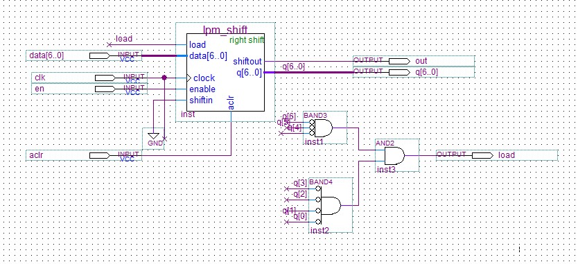 当移入7个0时,经band7到load端输入为1,则寄存器置数,q[6..0]重新置数为data[6..0],开始下一轮