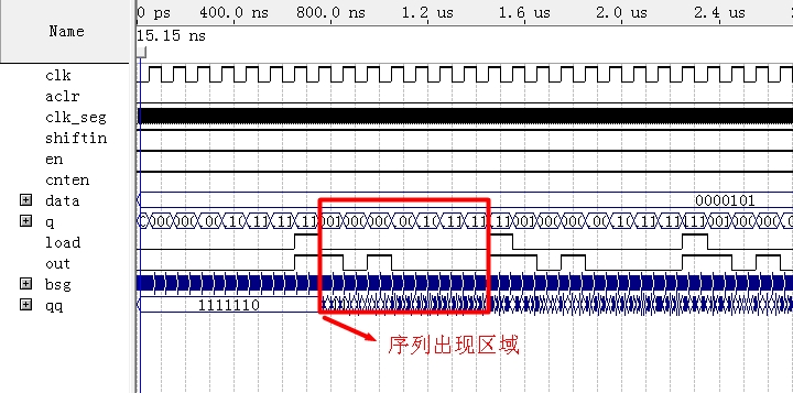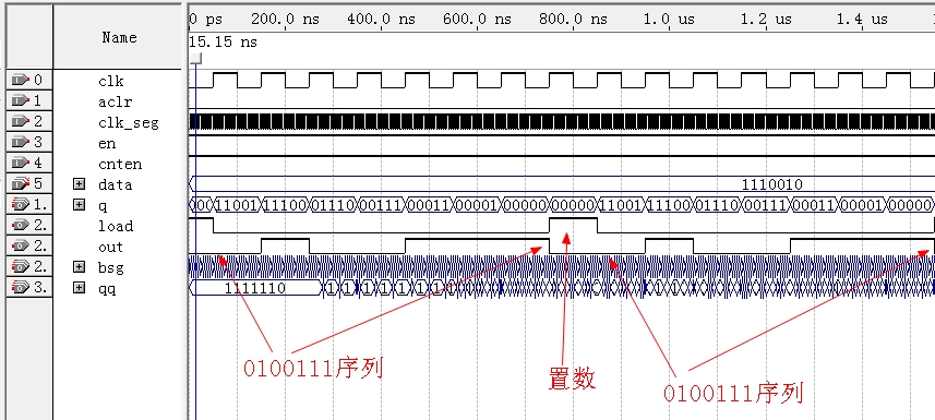 序列。注:q[6..0]是data[6..0]依次右移0的序列,并非所求序列并行输出,如果要接数码管,需再接一