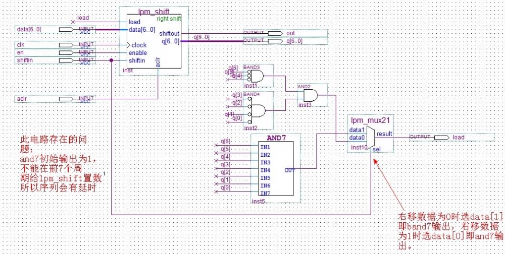 即只有输入全为0时输出才为1,这样就会出现问题,考虑序列0000011(生成序列为1100000,更一般的情况:生成序列最后一位位0时,此时应考虑移入1而不是0),当右移入2个0时,就已经是全0了,此时经band7输出为1,即load开始置数,不能得到预定序列: