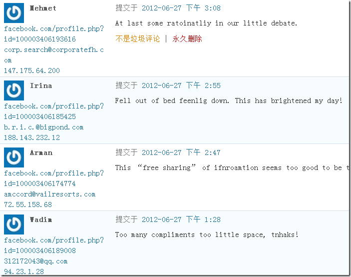 不过这次没那么幸运了,尼玛每个垃圾评论的IP都不一样,也不在一个IP段上: